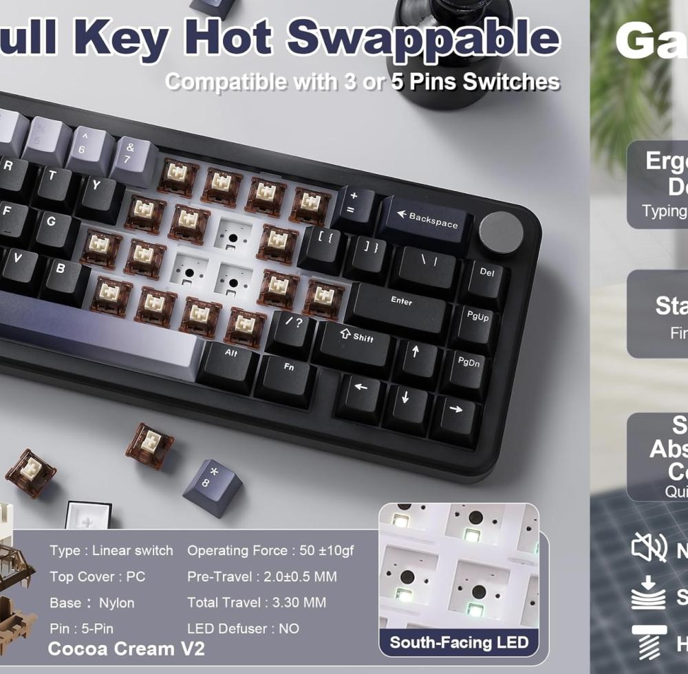- لوحة مفاتيح قابلة للتبديل السريع مع مفاتيح خطية: تتميز لوحة المفاتيح B68 بمقابس تبديل سريعة كاملة المفاتيح تدعم مفاتيح 3 دبابيس و5 دبابيس. تأتي لوحة المفاتيح الفقاعية هذه مع مفاتيح خطية مشحمة مسبقًا، مما يضمن تجربة كتابة سلسة وحريرية. المفاتيح ليست متينة فحسب، بل مصممة أيضًا لتدوم طويلاً، مما يوفر عمرًا طويلاً. بالإضافة إلى ذلك، يسمح لك التصميم القابل للتبديل السريع باستبدال المفاتيح بسهولة دون لحام، مما يوفر إمكانيات لا حصر لها لعشاق الأعمال اليدوية.