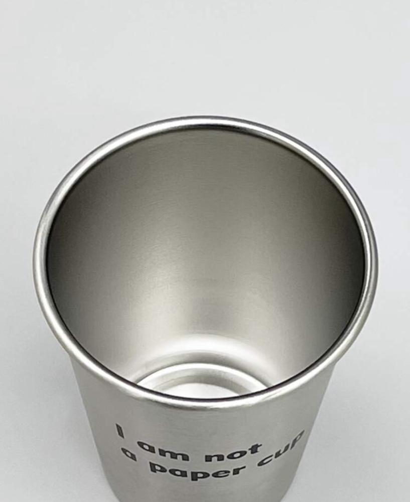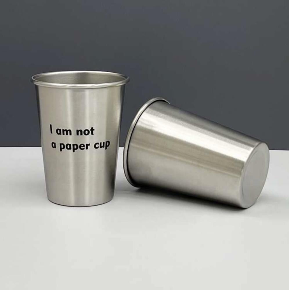 هذا الكوب مصنوع من الستانلس ستيل (الفولاذ المقاوم للصدأ) بتصميم بسيط وأنيق يشبه شكل الأكواب الورقية التقليدية، لكنه صُمم ليكون دائم الاستخدام. يتميز الكوب بعبارة مطبوعة عليه تقول: